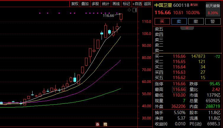 中国卫星(600118)封板涨停,再创历史新高,成交额超70亿元,最新市值1379亿元。